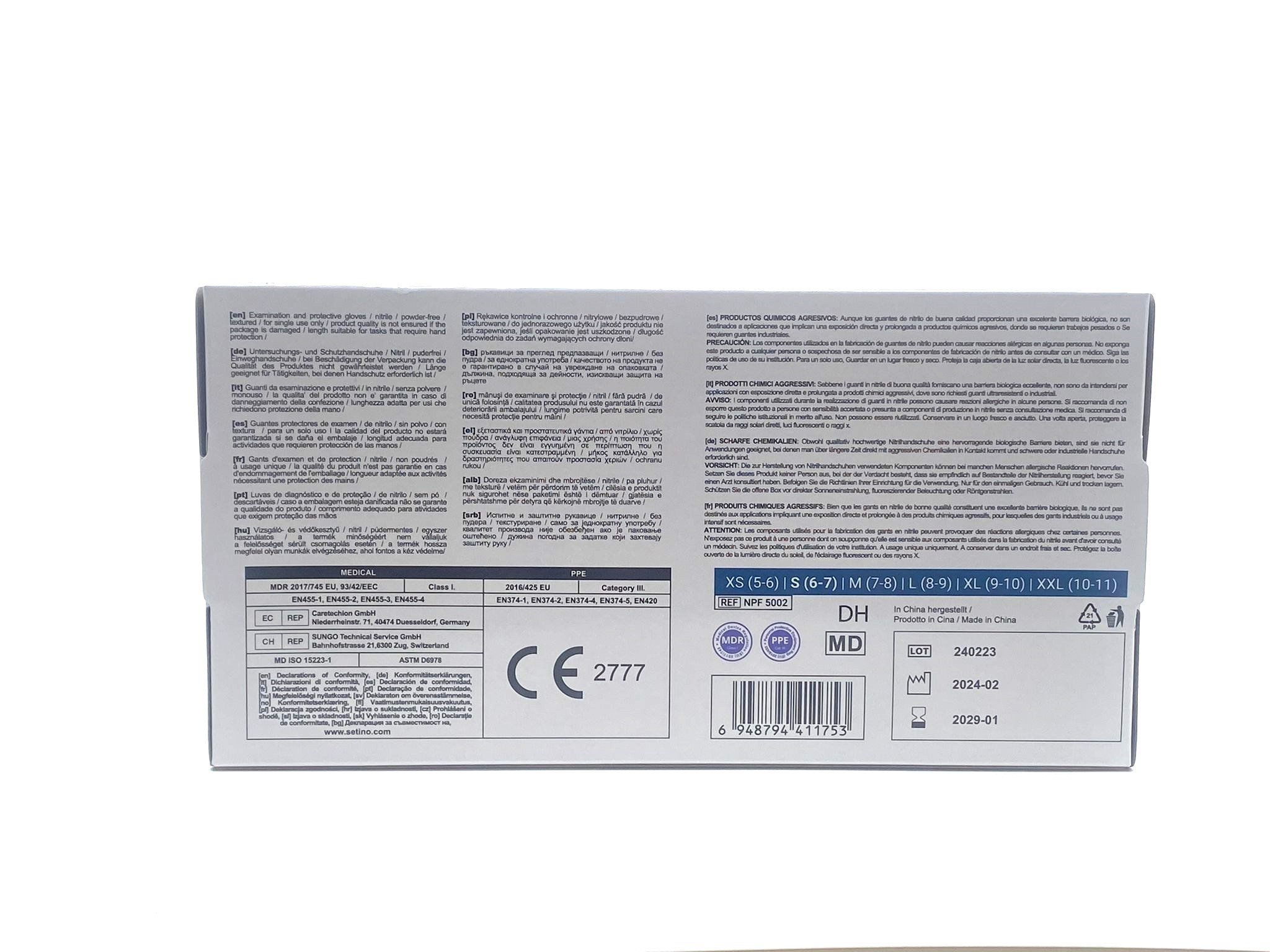Hmotnost rukavice 3,5g, pružnost 6N. Vhodné pro citlivou pokožku. OOP dle EU 2016/425 kategorie III., ZP dle EU 2017/745 třídy I., AQL 1,0, toušťka dlaně min. 0,06 mm, tloušťka prstu min. 0,08 mm, délka rukavice min. 240 mm, šířka dlaně rukavice 70 mm, válcovaná manžeta, teplota skladování 5-35°C, CE 2777 Balení 100 ks/box, 10 box/krt. UDI DI kód vytištěný na boxu i kartonu.