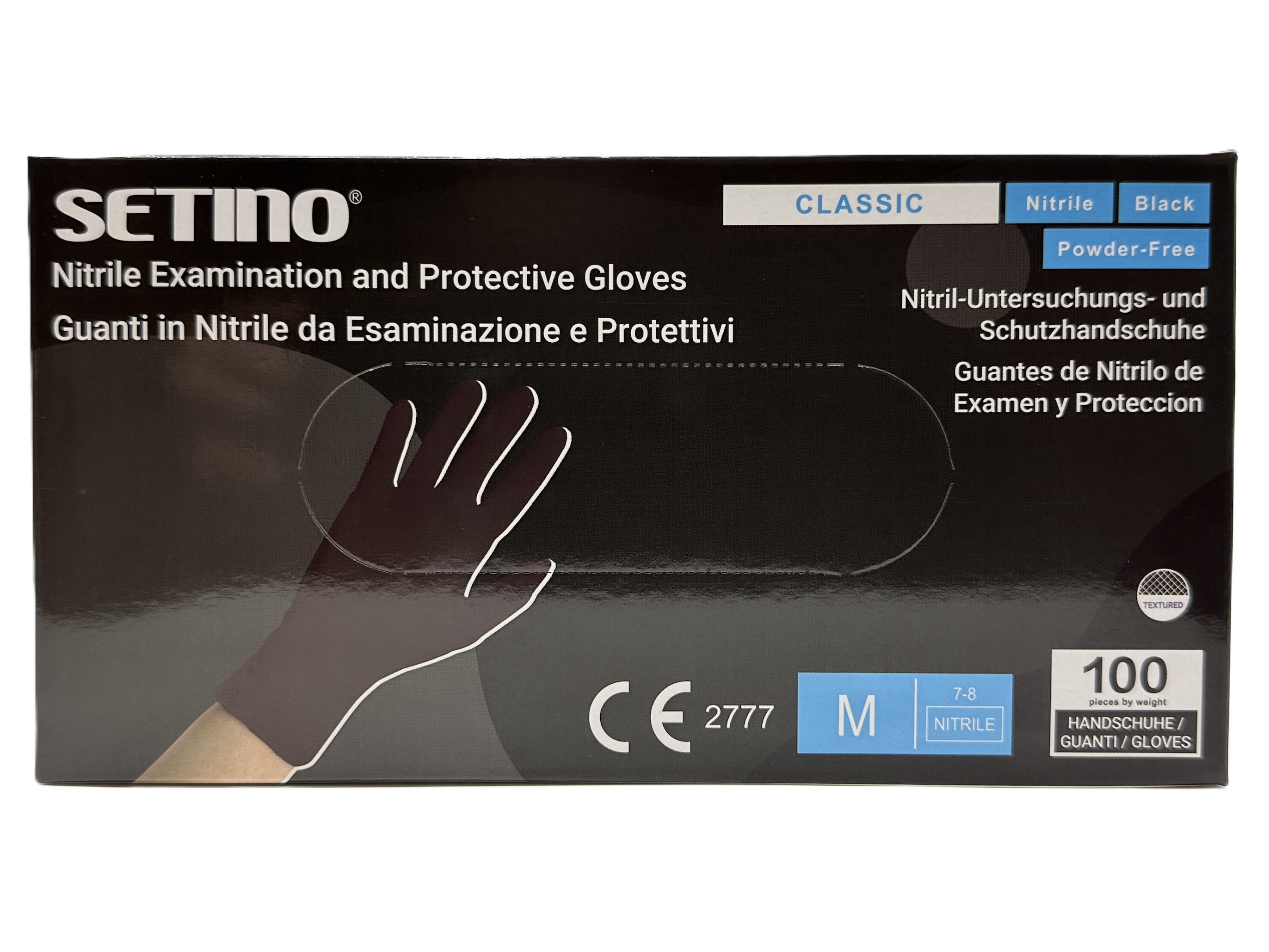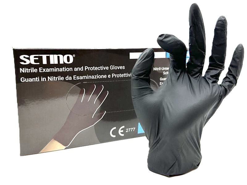 • Nitrilové jednorázové černé, nesterilní ochranné a vyšetřovací rukavice bez pudru texturované na špičce prstu, bezlatexové rukavice nejvyšší kvality SETINO vhodné nejen do zdravotnictví, ale i do průmyslu a potravinářství. Hmotnost rukavice 3,5g, pružnost 6N.