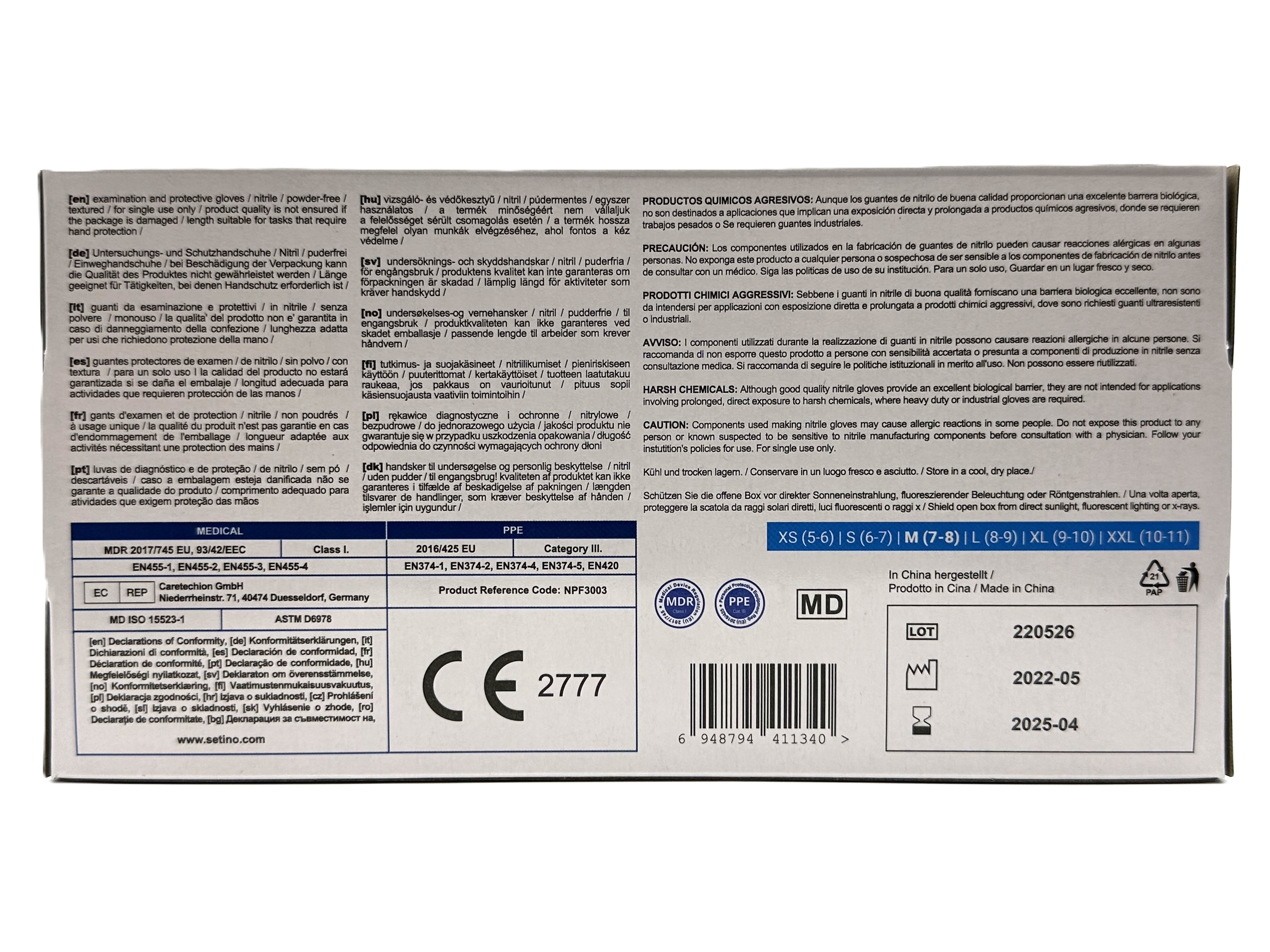 Vhodné pro citlivou pokožku. OOP dle EU 2016/425 kategorie III., ZP dle EU 2017/745 třídy I., AQL 1,0, toušťka dlaně min. 0,06 mm, tloušťka prstu min. 0,07 mm, délka rukavice min. 240 mm, šířka dlaně rukavice XS 70 mm, S 80 mm, M 95 mm, L 110 mm, XL 120, válcovaná manžeta, teplota skladování 5-35°C, CE 2777