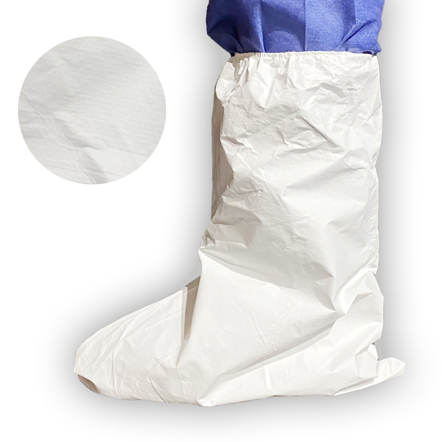 Jednorázový zvýšený návlek na obuv z netkané textilie vyrobený kombinací technologií spunbond (S) a meltblown (M) z polypropylenu 60g/m2, na vnější vrstvě Polyethylenová paropropustná folie, která se využívá pro zabránění průniku tekutin či separaci velmi jemných pevných částic.